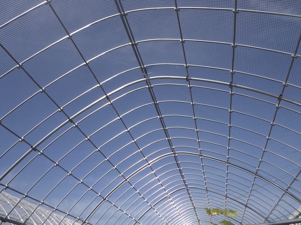 と、天窓フィルムが骨材に引き付けられ、風圧力や振動を軽減でき、破損が少なく吹きとばさ